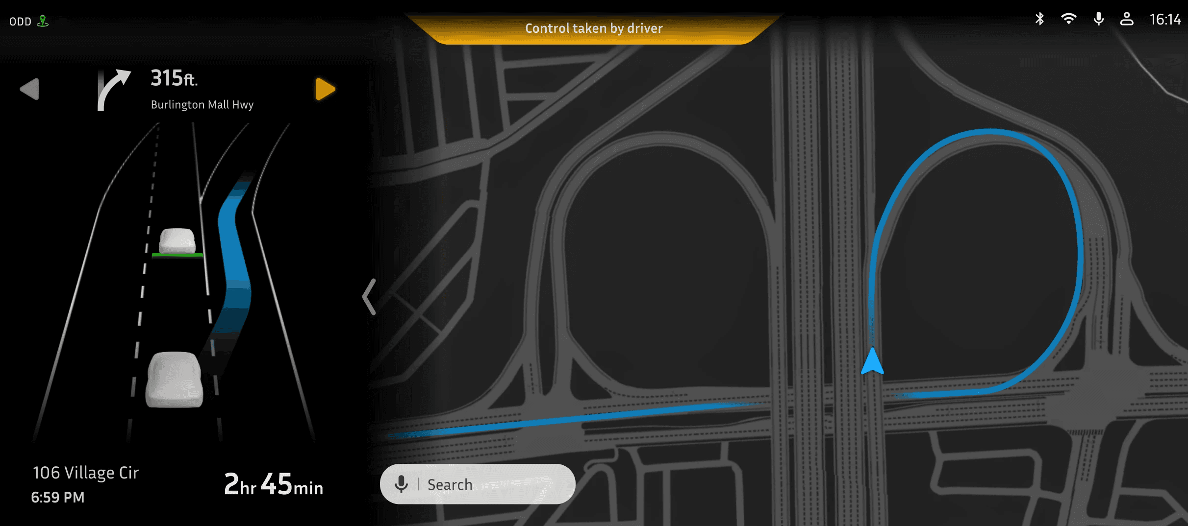 If the user directly intervenes via the steering wheel, the system instantly pauses all secondary activities (video/gaming). The UI expands into a high-density Road + Map layout, prioritizing tactical data to ensure a safe and immediate transition from passenger back to supervisor.